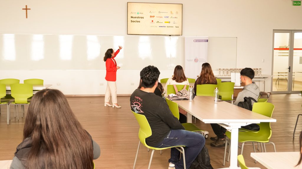 Durante la charla, se invitó a los estudiantes a escanear un código QR para acceder al curso Activa tu Talento Minero, compuesto por módulos breves y evaluaciones que introducen al funcionamiento de la industria y sus competencias claves.